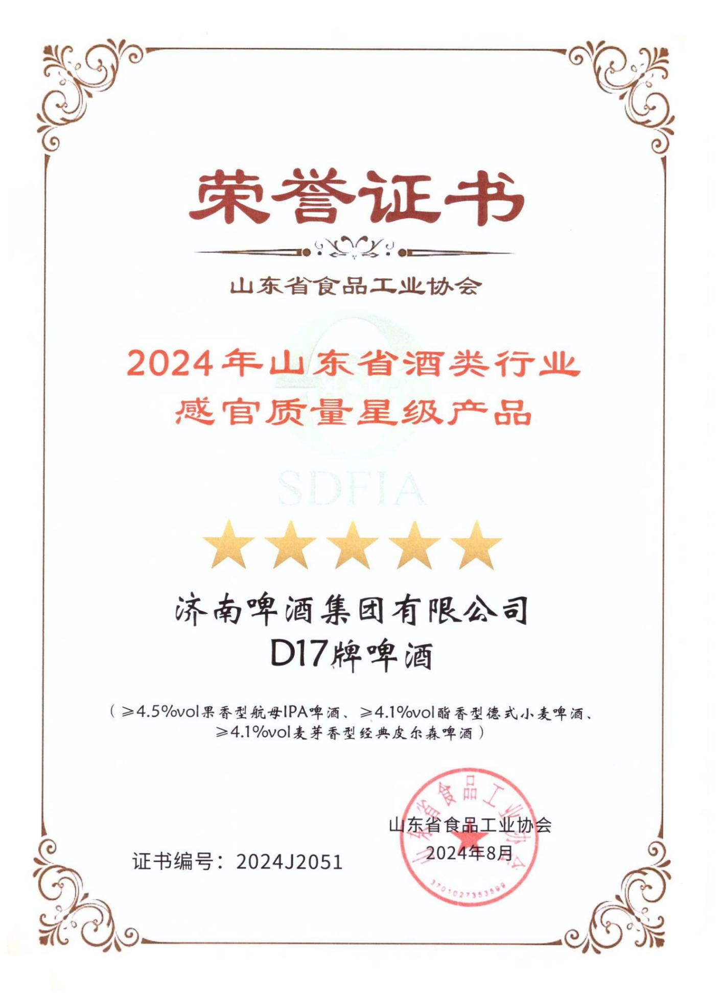 近日,在山东省食品工业协会举办的“2024年全省食品行业评委年会暨感官质量评价会”上,鲁商投资旗下济啤集团D17精酿啤酒凭借其卓越的品质和口感,荣获本届感官质量星级产品评价的最高荣誉——“5星级产品”以及“创新产品”奖。
