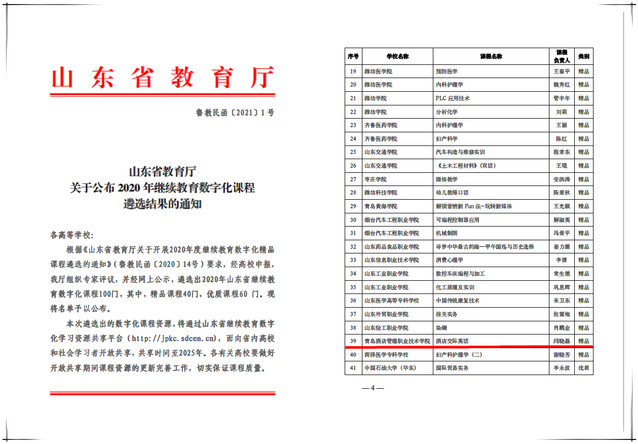 1月10日,省教育厅下发《关于公布2020年继续教育数字化课程遴选结果的通知》(鲁教民函﹝2021﹞1号),青岛酒店学院3门课程入选山东省2020年度继续教育数字化课程。