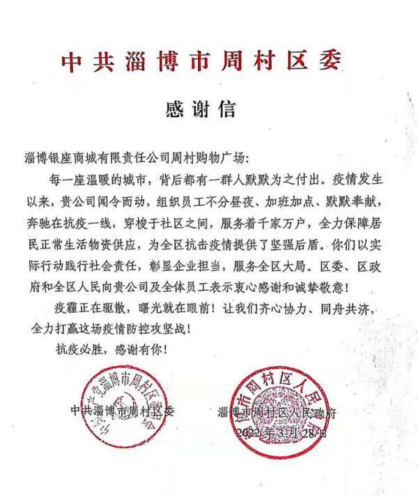 战疫有我 共迎暖阳丨周村银座抗疫保供获认可