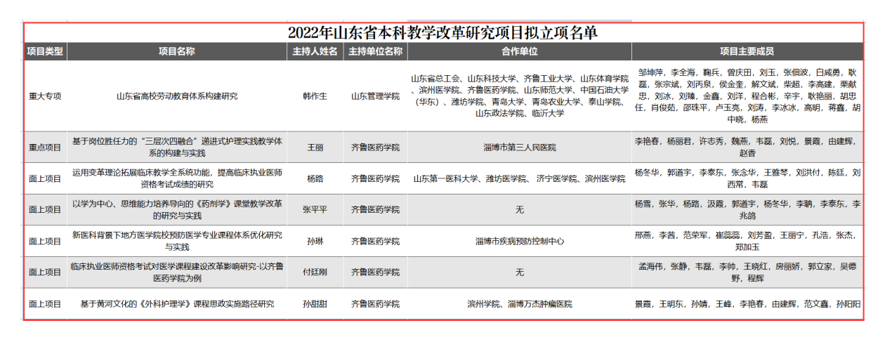 近日,省教育厅公布2022年山东省本科教学改革研究项目拟立项名单,齐鲁医药学院共7个项目获批立项,其中重大专项1项、重点项目1项、面上项目5项,立项率连续两年达到100%。