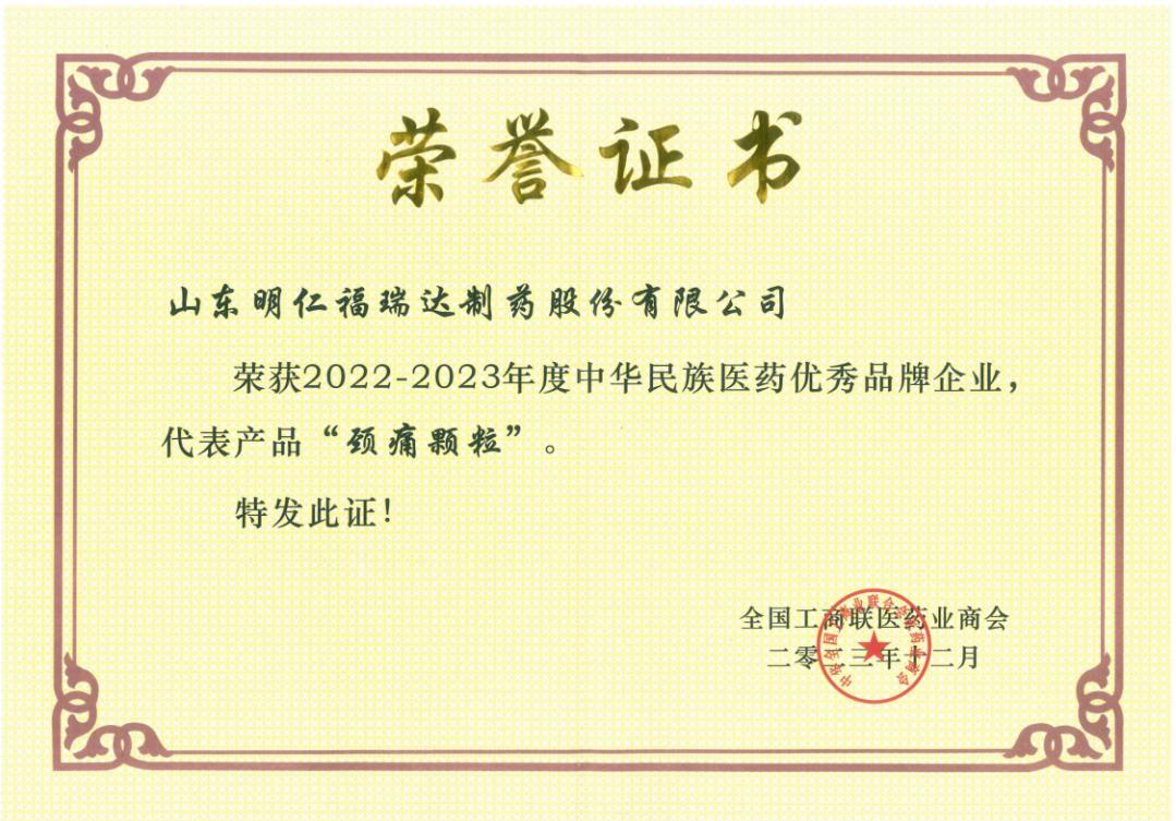 明仁福瑞达本次上榜代表产品颈痛颗粒是治疗神经根型颈椎病的系列中成药,具有活血化瘀、行气止痛之功效。近年来,明仁福瑞达利用山东省骨科疼痛类药物工程研究中心等科研平台优势,持续对颈痛颗粒进行创新和质量提升,被成功列为国家重点新产品,入选山东省火炬计划,获山东省制造业单项冠军产品等多项荣誉。