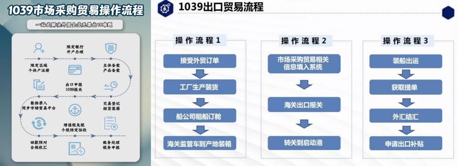 市场采购贸易方式(海关代码“1039”)指由符合条件的经营者在经国家商务主管部门认定的市场集聚区内采购的,单票报关单商品货值15万(含15万)美元以下并在采购地办理出口商品通关手续的贸易方式。