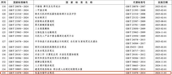 该国家标准规定了低温仓储作业的基本要求、作业场所、作业设备、作业要求、环境温度控制、安全管理、信息系统及信息管理、评价与改进,旨在为企业提供全面、科学的作业指南,确保低温仓储作业的高效、安全与规范。该标准替代《低温仓储作业规范》(GB/T 31078-2014),于2024年11月1日实施。