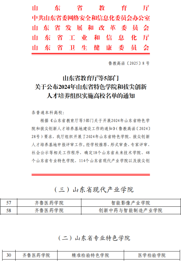 近日,山东省教育厅等5部门公布2024年山东省特色学院和拔尖创新人才培养组织实施高校名单,齐鲁医药学院申报的2个现代产业学院(智能影像产业学院、创新中药与智能制造产业学院)和1个专业特色学院(精准检验特色学院)全部获批,标志着学校在深化产教融合、服务区域产业发展方面取得新突破。