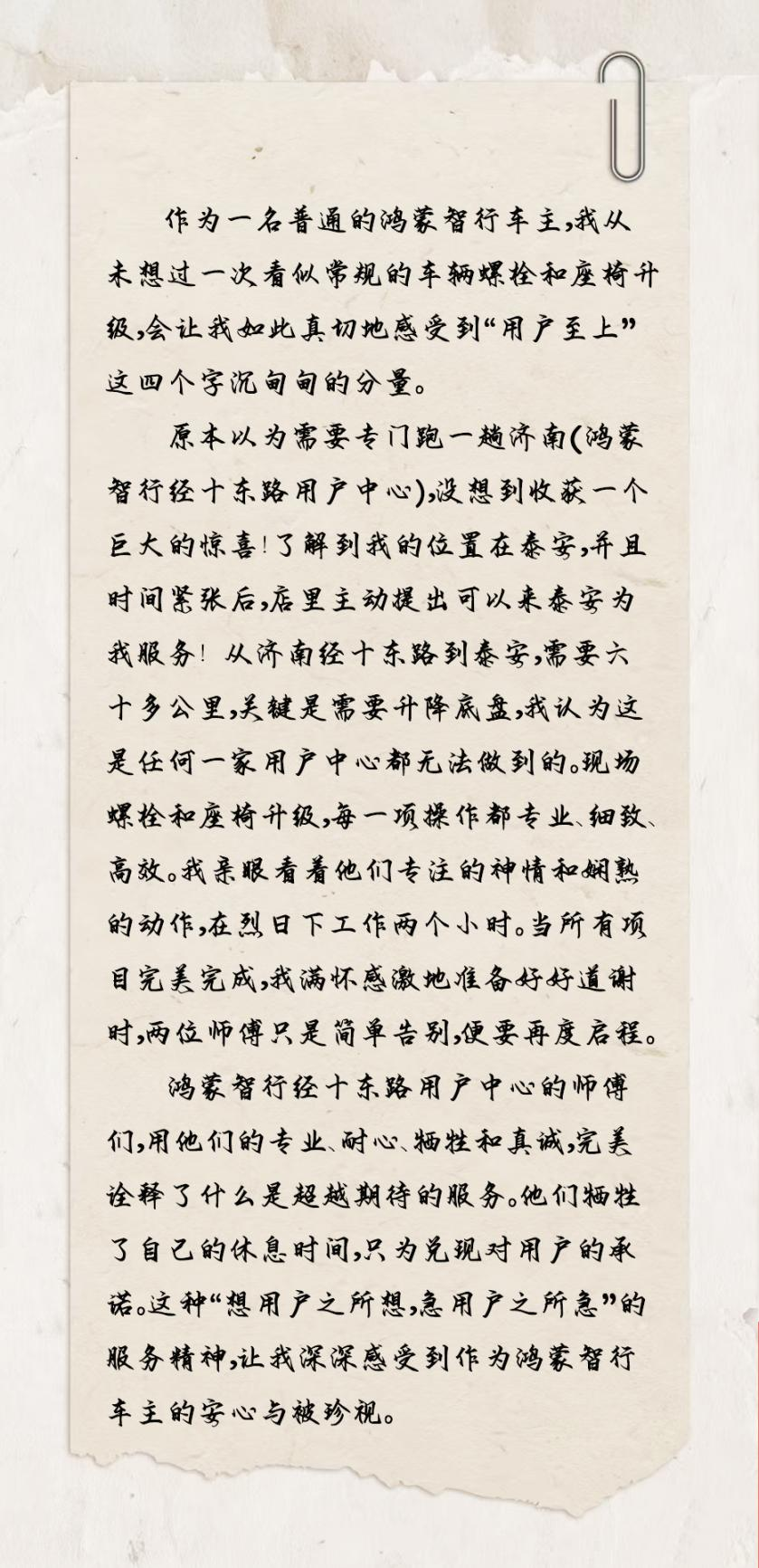 济南到泰安路程不短,客户到店一次来回就要耗费大半天时间。了解到客户需求以后,鸿蒙智行经十东路用户中心的同事专程赶到泰安,在客户公司楼下完成了座椅升级项目。客户对这次服务体验非常满意,将其发布到抖音平台后,获得了10W+浏览量,近三千点赞,评论区里大量网友都为这样极致贴心的服务点赞。真正便利、真诚、透明的服务,创造出超预期的情感连接,让更多用户了解并享受到服务到家的福利。