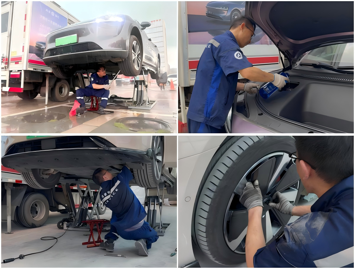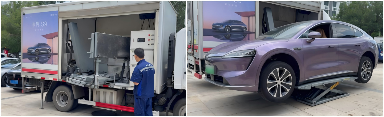 多功能移动服务车配备新能源诊断仪、车辆举升机、全套检修工具等设备,技术标准与店内完全一致。