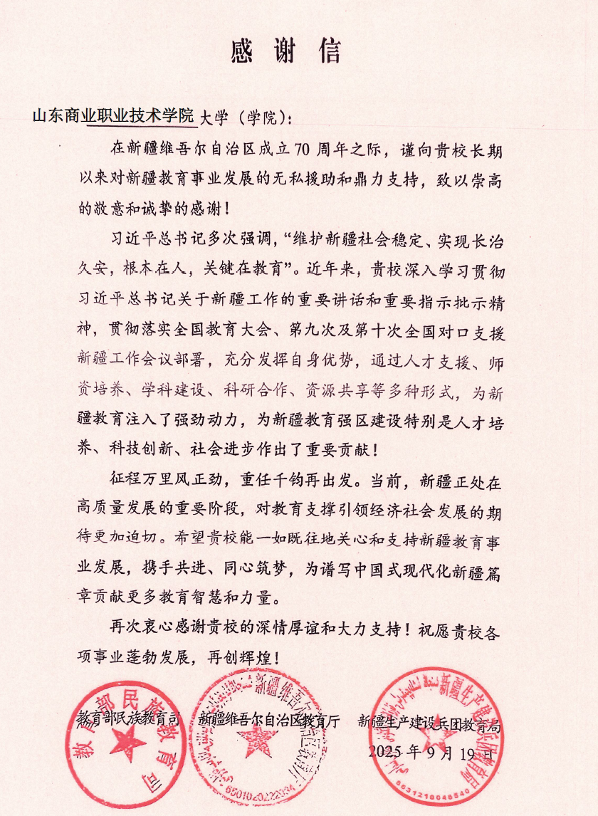 近日,教育部民族教育司、新疆维吾尔自治区教育厅与新疆生产建设兵团教育局联合向山东商职学院发来感谢信,对山东商职学院“长期以来对新疆教育事业发展的无私援助和鼎力支持,致以崇高敬意与诚挚感谢”!