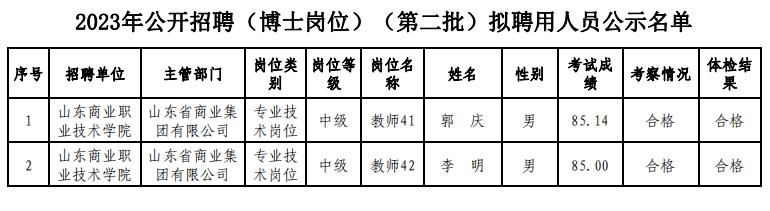 根据《中共山东省委组织部 山东省人力资源和社会保障厅关于印发2023年度省属事业单位公开招聘工作实施方案的通知》(鲁人社发〔2022〕23号)和省属事业单位公开招聘有关政策规定,按照岗位招聘计划,山东商业职业技术学院组织完成了2023年公开招聘(博士岗位)(第二批)工作人员考试、体检、考察等工作,现对该单位拟聘用人员进行公示。公示期为7个工作日,自2024年1月31日至2024年2月7日(不含节假日)。公示期间,如对公示人员有异议,请向山东省商业集团有限公司组织人力资源部反映。反映问题要实事求是,并告知真实姓名及联系方式。
