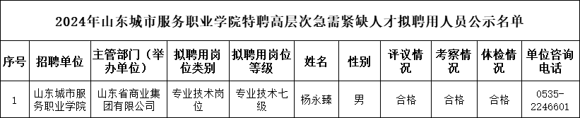根据《山东省事业单位高层次急需紧缺人才特聘办法》(鲁人社规〔2017〕22号)等相关规定,山东城市服务职业学院通过特聘方式聘用高层次急需紧缺人才,现对拟聘用人员进行公示。公示期为7个工作日,自2024年5月30日至2024年6月7日(不含节假日)。公示期间,如对公示人选有异议,请及时向山东省商业集团有限公司反映。